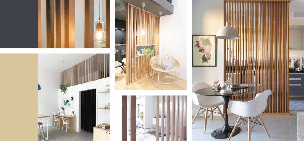 Des lames bois verticales, fixes ou pivotantes peuvent être une belle idée de séparation. Le bois va donner de la chaleur à votre intérieur, associé à une belle lumière cela donne un effet d’ombre qui embéllit l’espace. Les lames peuvent etre posées de manière régulières ou non, très espacées ou plus resserées…