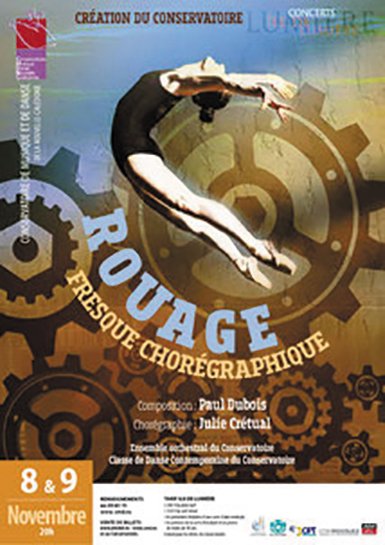 Dans un monde où tout est automatisé, un homme, simple rouage se désolidarise. Petit à petit, il découvre le monde au-delà des machines. S’ensuit un voyage initiatique à la recherche de son moi intérieur. Découpée en trois actes et neuf tableaux, « Rouage » est une fresque chorégraphique inventée et interprétée par le Conservatoire de musique et de danse de Nouvelle-Calédonie. Le répertoire reflètera les influences du compositeur Paul Dubois, mélanges de musique orchestrale, de musiques traditionnelles et de morceaux improvisés.