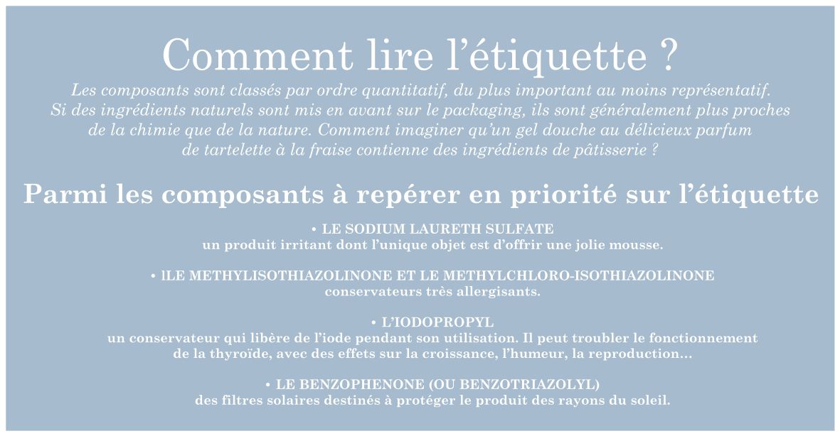 Les gels douches que nous consommons concentrent 10 à 40 ingrédients, dont des agents lavant, hydratants et émollients -pour faire glisser le produit sur la peau. Ils contiennent aussi du parfum, synthétique dans la très grande majorité des cas, et des conservateurs, destinés à empêcher la prolifération de bactéries au contact de l’air. Et la mousse, nous direz-vous ? Il faut être réaliste, pour obtenir ces jolies bulles, les fabricants ont recours à la chimie. Ils ajoutent du sodium laureth sulfate, un produit très irritant pour la peau, que l’on retrouve dans la composition du liquide vaisselle ou des détergents industriels. Regardez bien l’étiquette de vos produits, vous être presque sûrs d’en trouver.