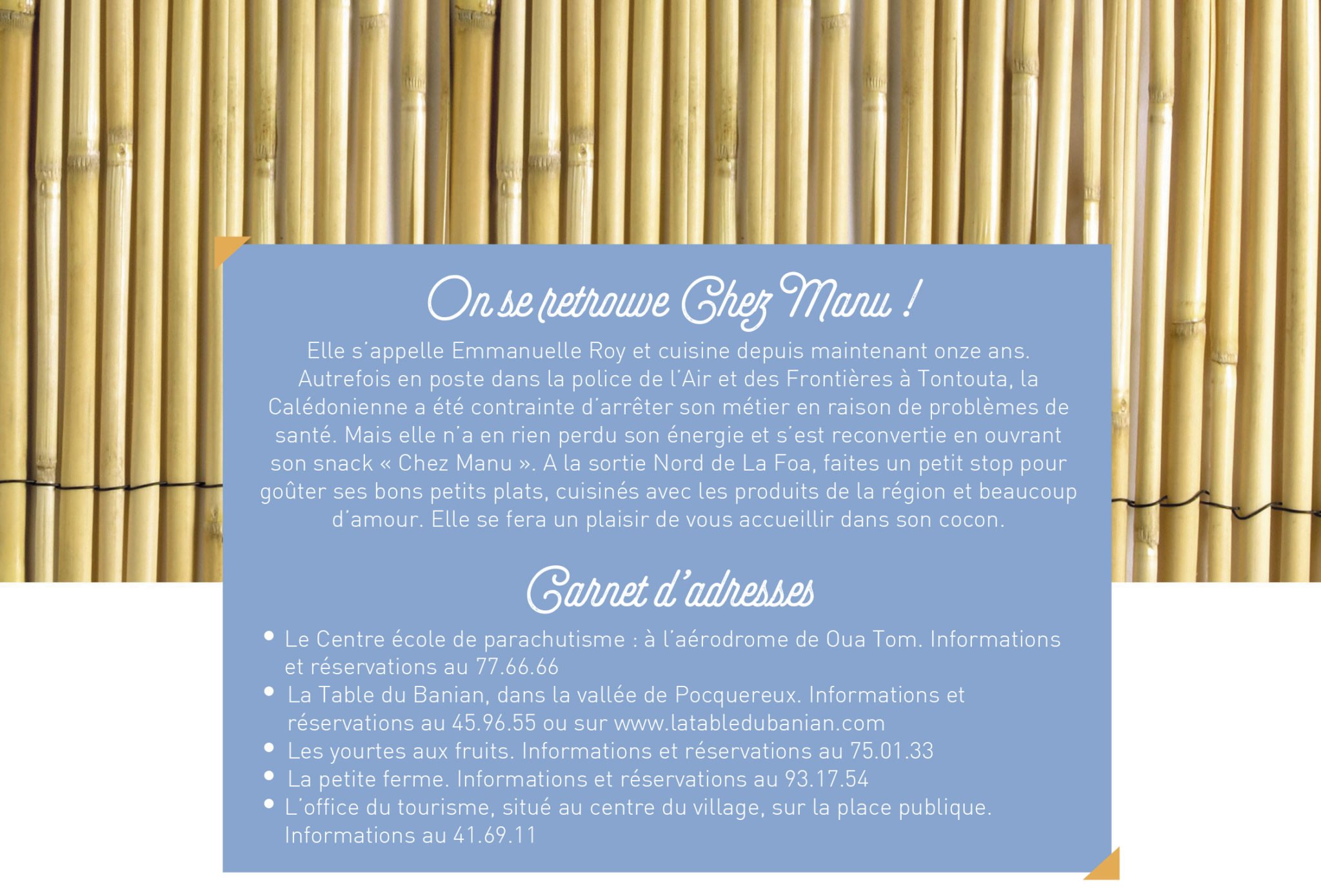 Avoir les pieds sur terre, c’est bien aussi. Après notre épique montée d’adrénaline, il est temps de retrouver la sérénité de la terre ferme. La région est connue et reconnue pour ses nombreux gîtes et tables d’hôtes, le meilleur moyen selon nous, pour mêler plaisirs et découverte. La gentillesse et l’accueil des locaux y sont d’une grande qualité. Dans la vallée de Pocquereux, au cœur des exploitations agricoles de la région, se trouve un petit coin de verdure et de tranquillité qui répond au doux nom de « La Table du Banian ». Depuis bientôt trois ans, Annick Sadimoen propose aux plus gourmands de délicieux mets, préparés avec amour et saveur, avec de délicieux produits du terroir. Sa cuisine est à son image : métissée et profondément calédonienne. Elle se fera un plaisir de vous accueillir à sa table, le temps d’une dégustation locale. Pensez simplement à réserver à l’avance.